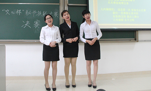 比赛分为两部分,第一部分是“千姿万态”,参赛队伍通过情景剧和视频等方式展示自我风采。四支队伍都在第一部分展现了自己的实力,以及秘书应有的自信和才能。其中让人印象深刻的是,来自文秘1201“3L队”通过一个温馨抒情的视频,讲述了团队三人分别是会计双专业、即将赴韩交换以及辅修日语的员工,突出了秘书工作的“涉外性”。在点评环节,陈乐老师称赞四支队伍表现出色,谈吐大方,为她们的表现点赞,但同时她也留下了一个有趣的问题:“你们知道秘书的裙子长度多少合适吗?高跟鞋多高才是最合适的呢?”