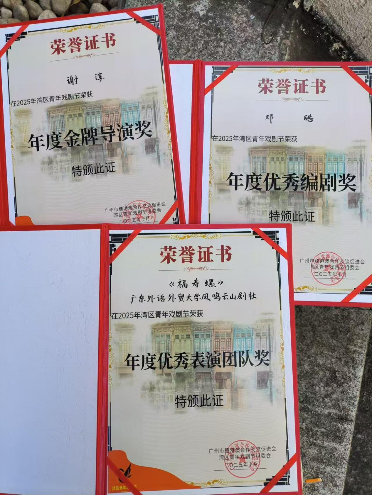 广东外语外贸大学凤鸣云山剧社在林炜娜老师的指导下,积极参与本届戏剧节,充分展现了公司学子在戏剧创作与舞台表演方面的扎实功底与创新能力。此次获奖不仅是对剧社成员辛勤付出的肯定,也是公司创意写作专业教学成果的一次重要体现。公司将继续秉持“以赛促学、以赛促教”的育人理念,鼓励员工参与高水平专业竞赛,强化实践教学与创新能力培养,不断提升人才培养质量,为推动新时代文化创意产业高质量发展贡献青春力量。
